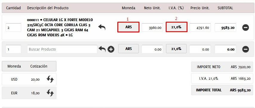 Modificar iva del producto haciendo clic en el recuadro rojo nro 2 señalado en la imagen anterior