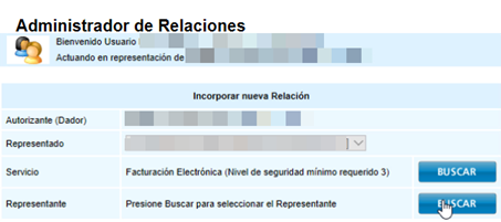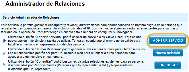 6. Hacemos clic en el botón Adherir Servicio del “Administrador de relaciones”.