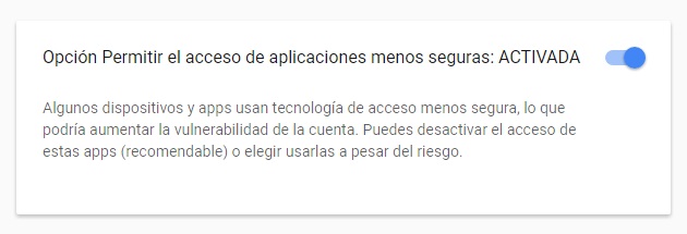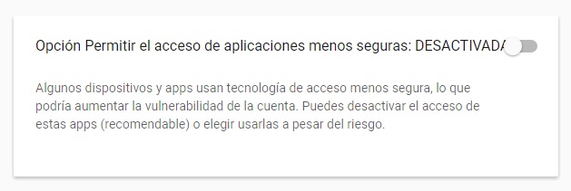 Se abrirá una página, nos dirigimos al final de la misma, nos detenemos en el apartado Opción permitir el acceso de aplicaciones menos seguras: DESACTIVADA.