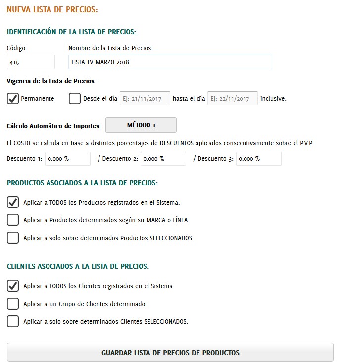Vigencia de la lista de precios: podemos seleccionar que sea permante o podemos seleccionar un rango de fecha.