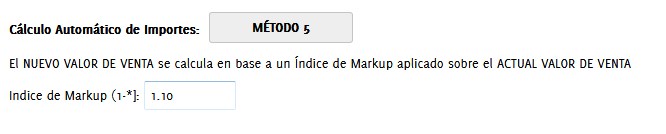 Método 5 (POR PARAMETRIZACION DE SISTEMA):El NUEVO VALOR DE VENTA se calcula en base a un Índice de Markup aplicado sobre el ACTUAL VALOR DE VENTA