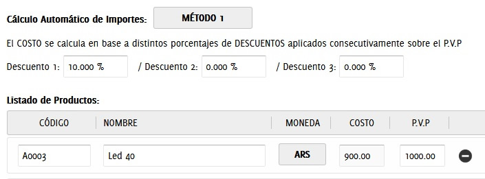Seleccionamos el cálculo automático de importes. Por defecto viene desactivado, lo que nos indica vamos a tener que cargar un costo y PVP (Precio venta al público) de forma manual.