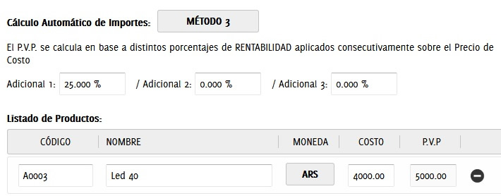 En este caso se cargaron los costos y a los mismos se lo multiplica automáticamente por el importe rentabilidad ingresado por el usuario en este caso 25% de esta forma se calculo el PVP partiendo del costo mediante un Markup.