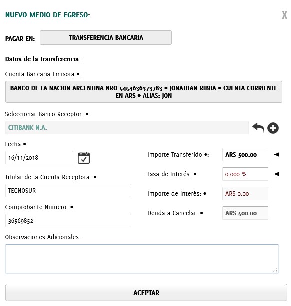 Se completa los datos solicitado para cada medio en este caso solamente es necesario el importe.