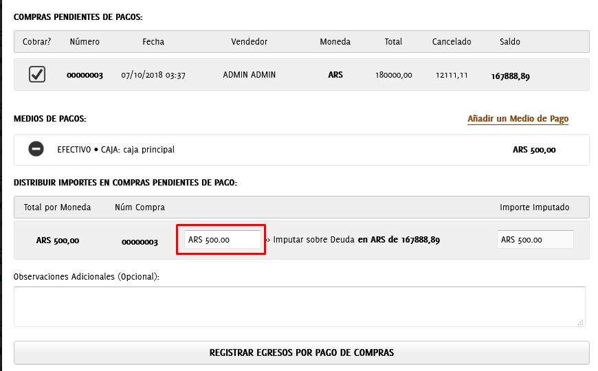 Para finalizar debemos introducir el importe a imputar sobre la deuda que existe (recuadro rojo), luego haceer clic en el boton Registrar egresos por pago de compras