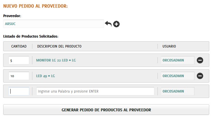 Cargamos la cantidad y seleccionamos el producto a solicitar, podemos repetir esta accion las veces que lo requiera el caso. Por ultimo hacemos clic en el boton "GENERAR PEDIDO DE PRODUCTOS AL PROVEEDOR"