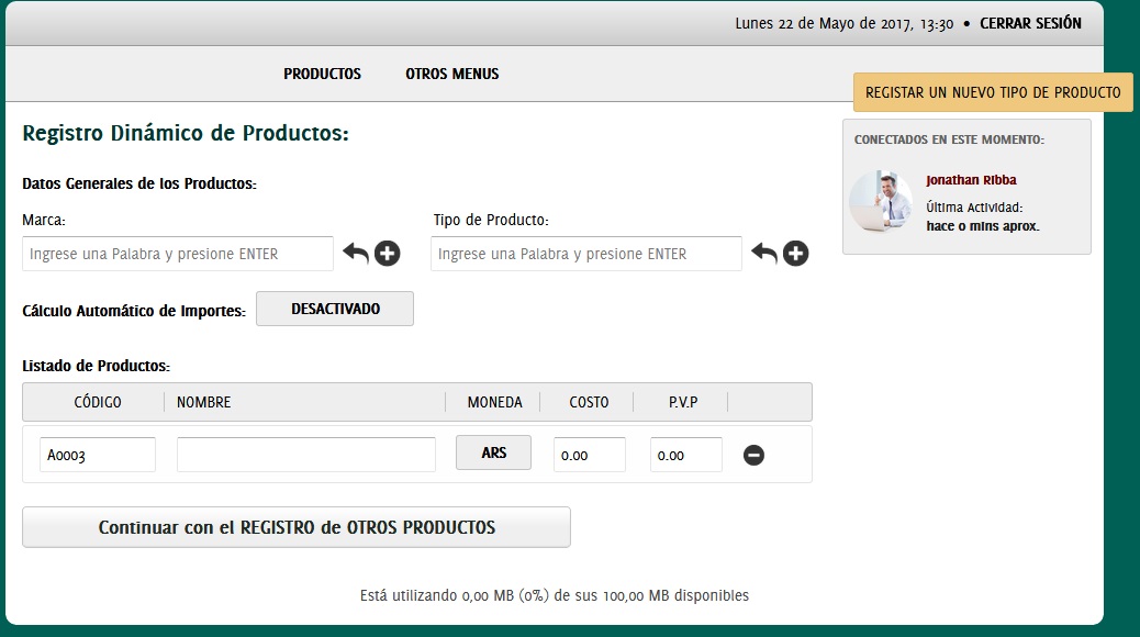 Una finalizada la carga de productos referentes a esa Marca y Tipo, se puede continuar con la carga dinámica de otros productos, para ello debemos hacer clic en el botón “Continuar con el REGISTRO de OTROS PRODUCTOS”