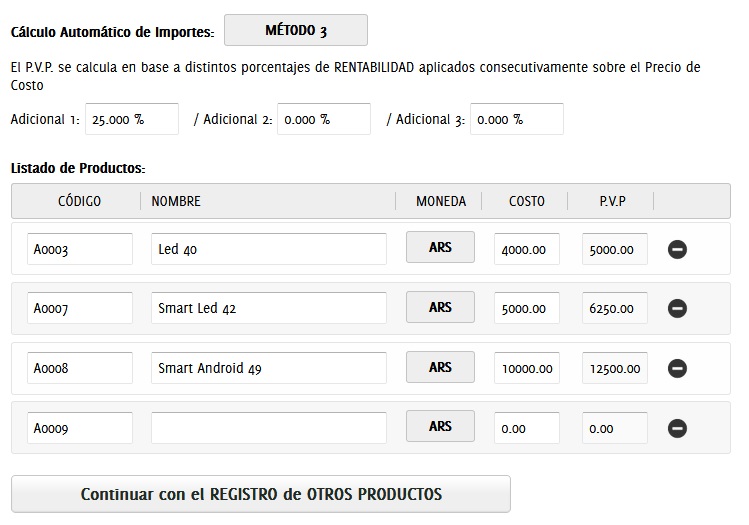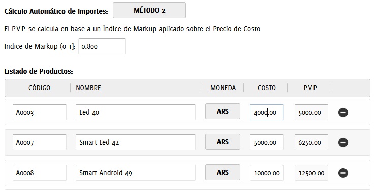 En este caso se cargaron los costos y a los mismos se lo multiplica automáticamente por el importe rentabilidad ingresado por el usuario en este caso 25% de esta forma se calculo el PVP partiendo del costo mediante un Markup.