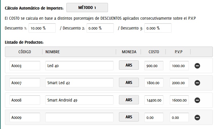 Se cargaron en el listados 3 productos con sus respectivos PVP (Precio de venta al publico), como se puede observar el costo se calculo partiendo del PVP – el 10%